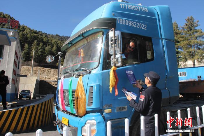 图为西藏边检总站执法调查支队民警向过往车辆驾驶员开展宣传。西藏边检总站执法调查支队供图